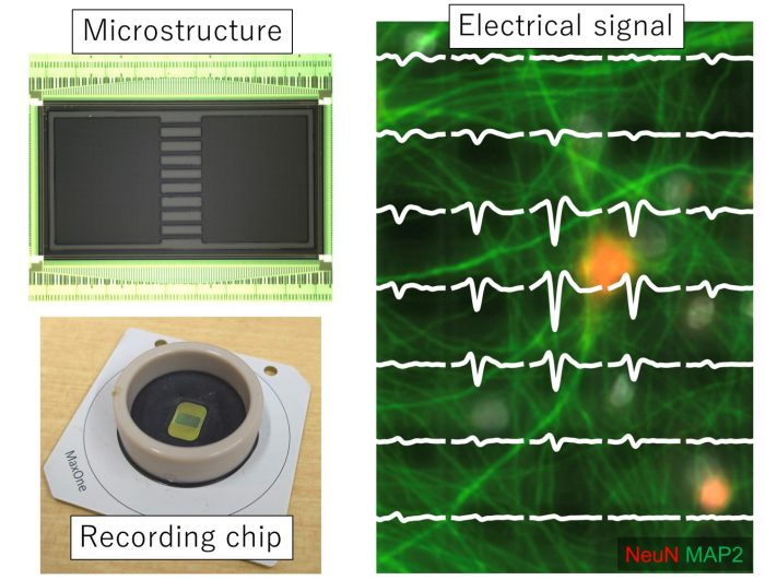 The brain functions are expressed with complicated networks formed by a large number of neurons. To understand complex brain functions from a simpler system, we measure the activity of cultured neurons using high density microelectrode array (HD-MEA) chips with 26,400 electrodes. After measurement, targeted proteins are stained to evaluate the relationship between cell type and function.